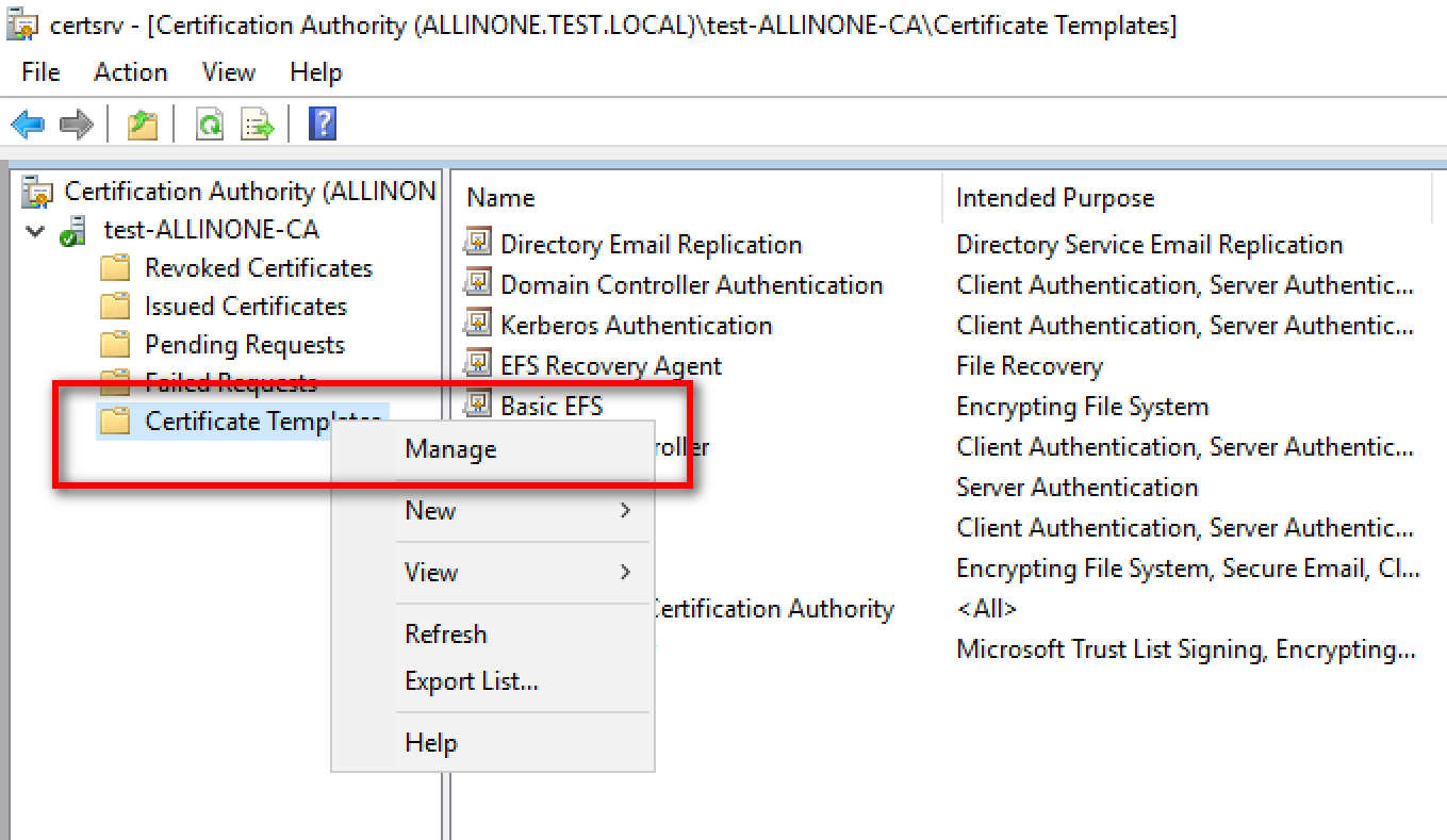Schritt 1, Öffnen der „Certificate Templates Console“, das geht am einfachsten innerhalb der „Certification Authority Mangament Console mittels „Manage“ auf dem Konten „Certificate Templates“