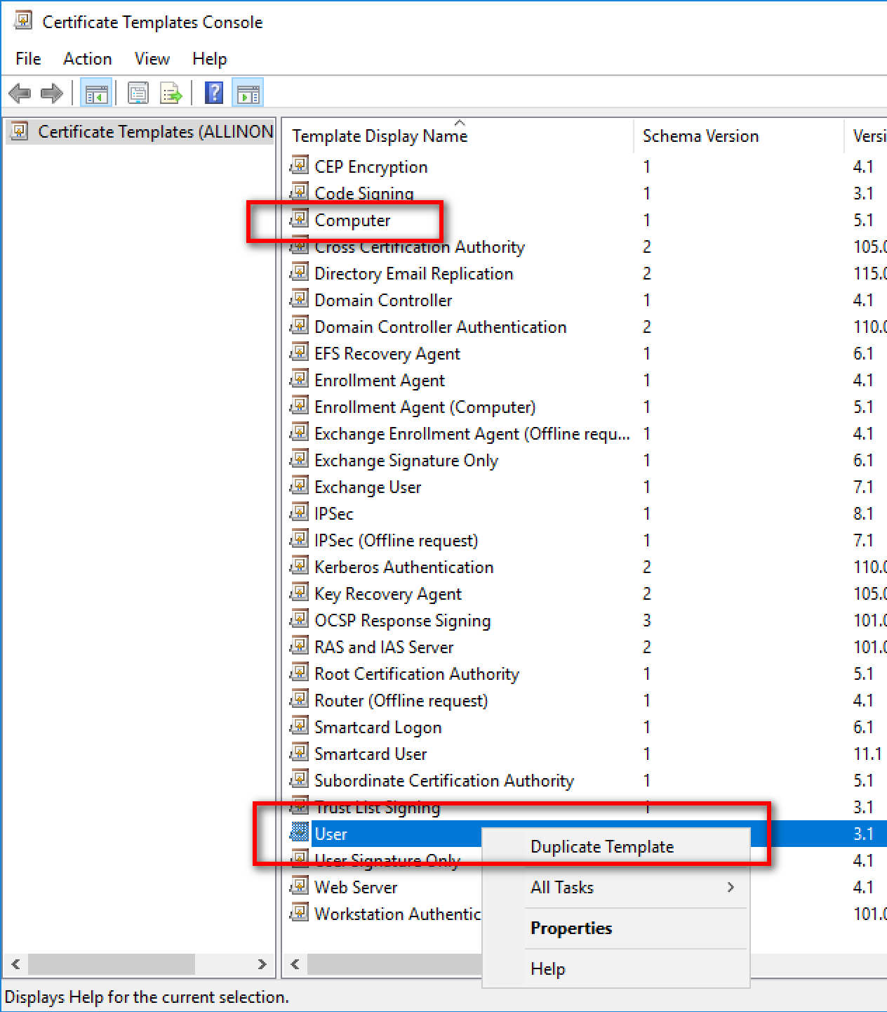 Schritt 2, Duplizieren einer Built-in Vorlage, in meinem Fall dupliziere ich die „User“ Vorlage und nenne das Duplikat „AutoEnrole User“, und ich dupliziere „Compuer“ zu „AutoEnrole Computer“