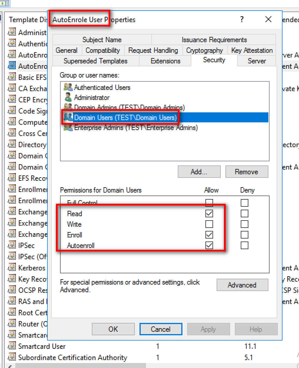 Schritt 3, die neue „AutoEnrolle…“ Vorlage wird nun so berechtigt, dass die entsprechenden Benutzer bzw. Computer Lese, Enrole und Autoenrole Berehctigung erhalten