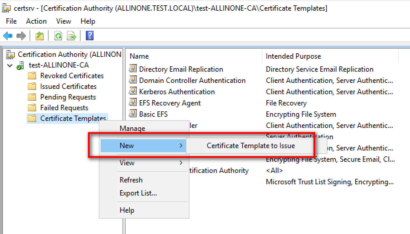 Schritt 4, Zuweisen der neu erstellten „AutoEnrolle…“ Vorlagen zur CA mittels „New | Certificate Template to Issue“