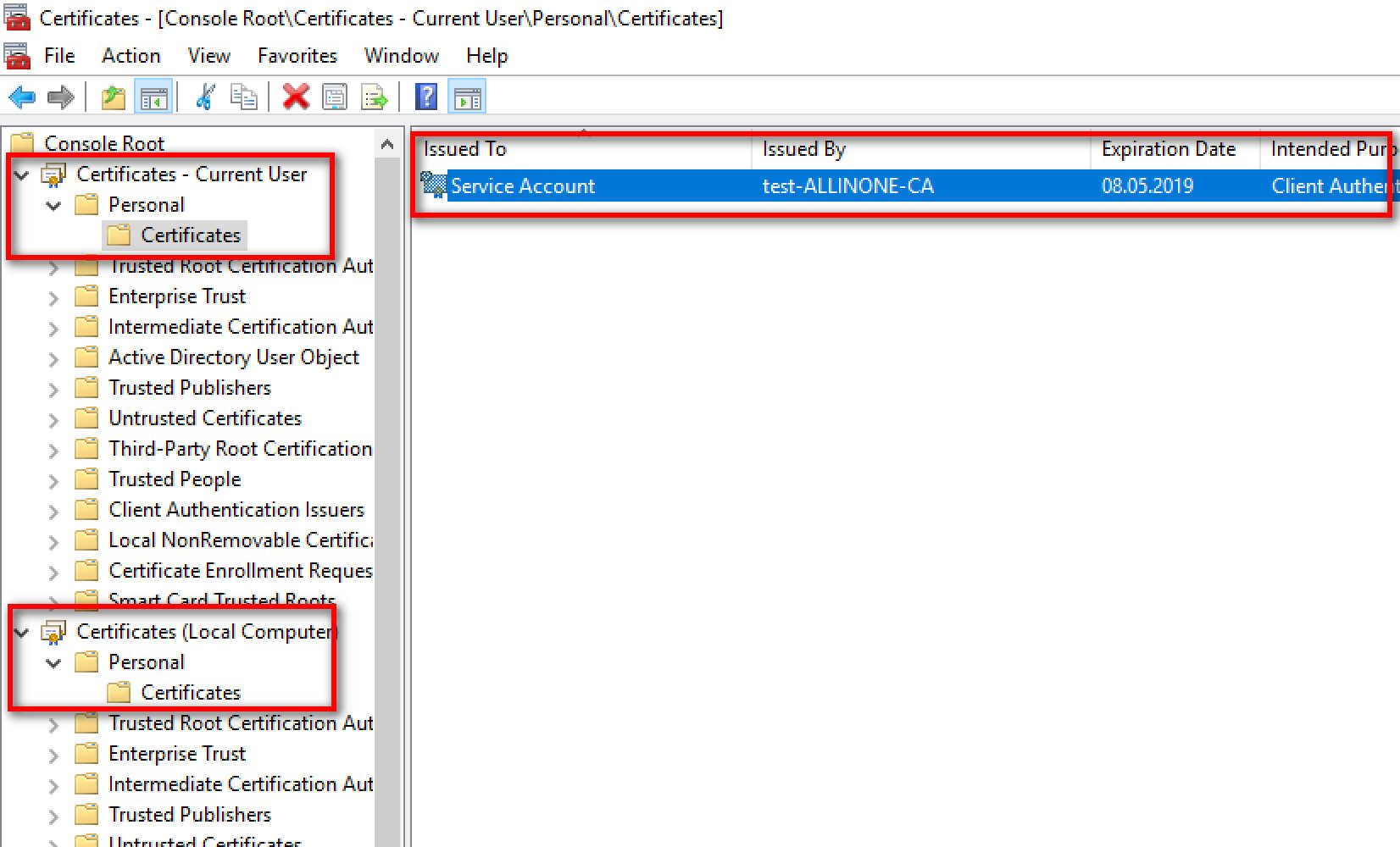 Schritt 7, Überprüfen des Ergebnisses durch Anmeldung an einem entsprechenden Computer bzw. mit einem entsprechenden Benutzers der ein Zertifikat bekommen soll. Wenn man nun ein Blick in die Zertifikatsverwaltung wirft, findet man dort unterhalb von Current „User|Personal|Certifiactes“ bzw. „Local Computer|Personal|Certifiactes“ das entsprechende Zertifikat welches mittels Auto Enrollment erstellt und zugewiesen wurde.