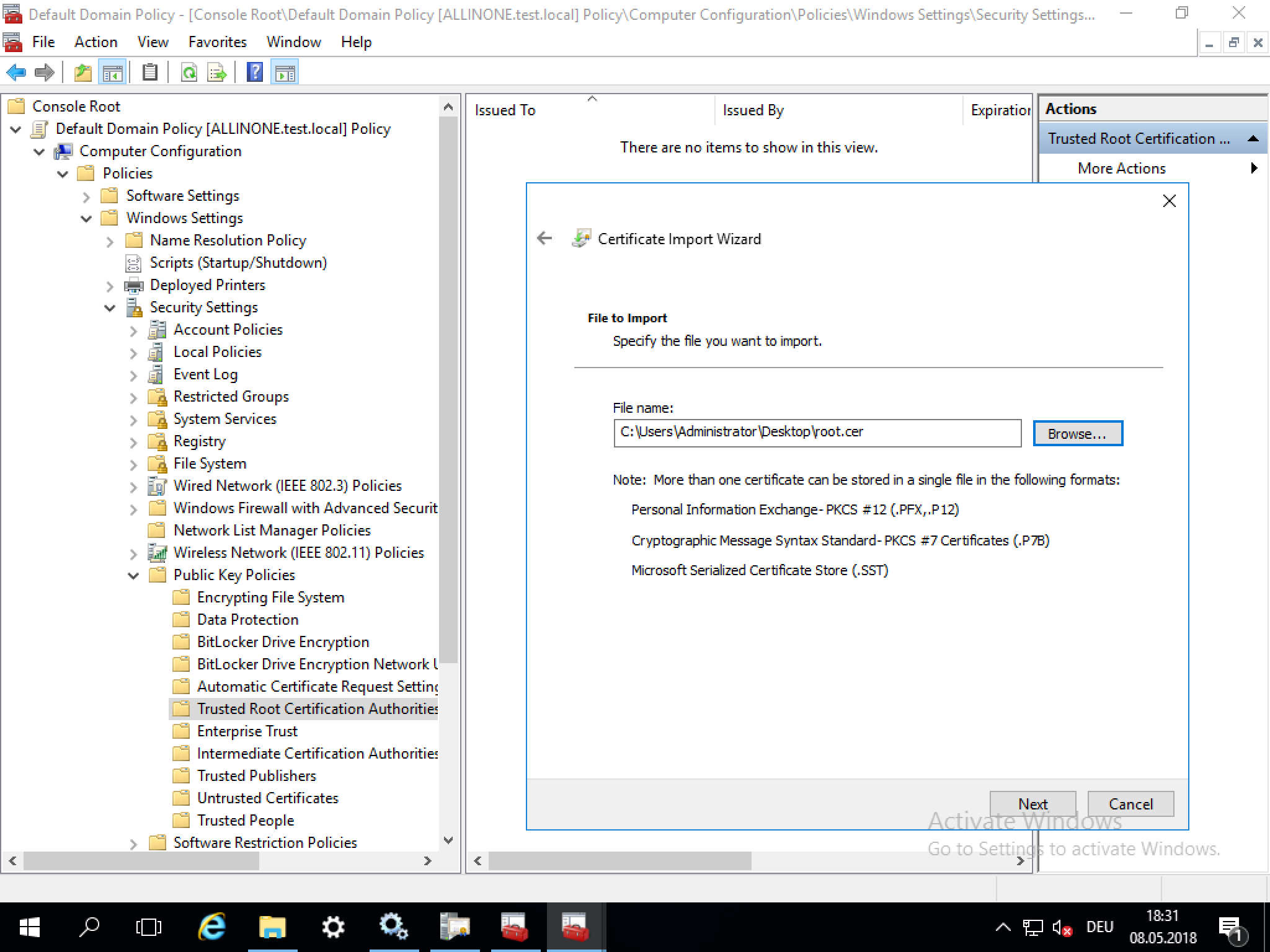 Schritt 8, optional, falls noch nicht anderweitig geschehen, kann man sein zugehöriges Root Zertifikat gleich mit verteilen lassen, dies geht per Gruppenrichtlinie unter „Computer Configuration|Policies|Windows Settings|Security Settings|Public Key Policies|Trusted Root Certificate Authorities|Import“