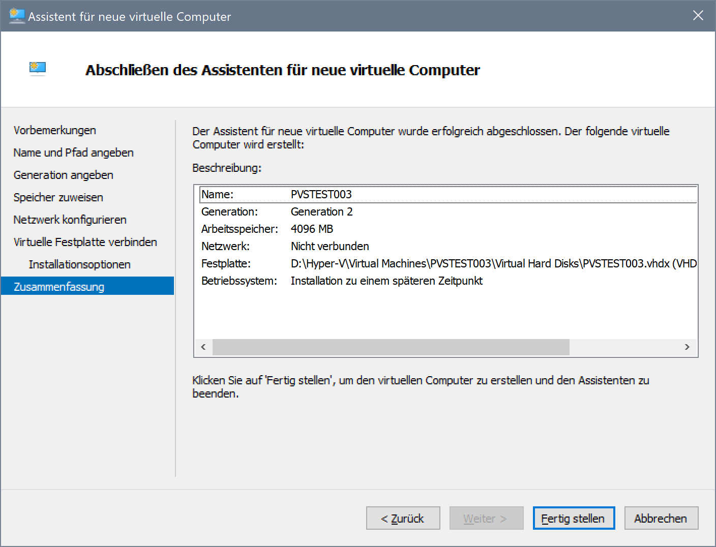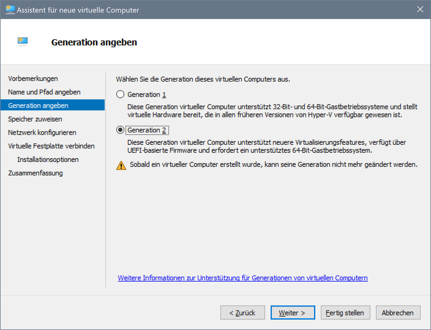 Als erstes starten wir mit der Erstellung einer Hyper-V VM vom Type „Generation 2“