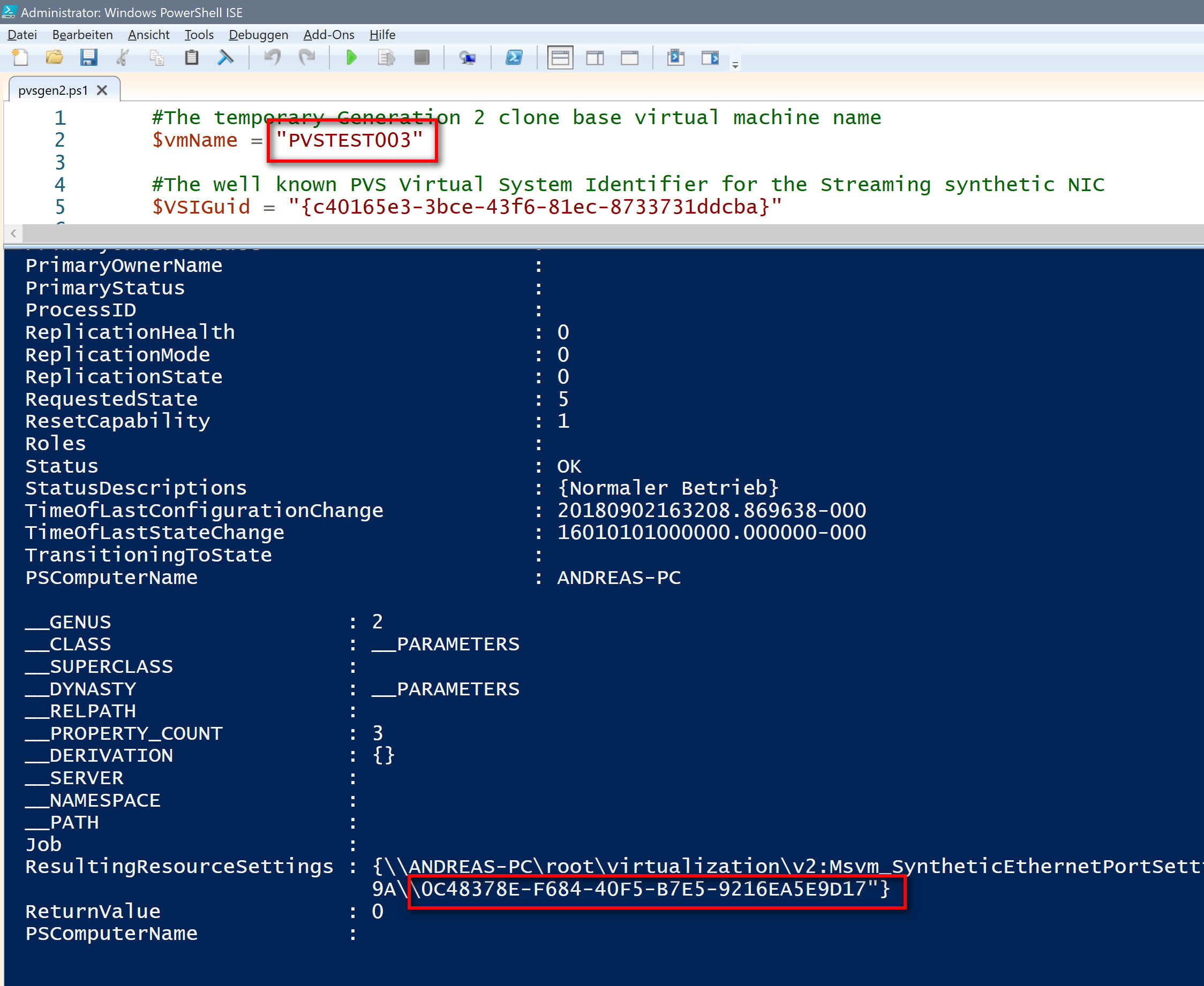 Dieses Script muss man auf das Hyper-V System kopieren, in Zeile 2 muss man den Namen seiner VM eintragen, und danach führt man das Skript aus. Das Skript fügt der VM nun eine Netzwerkkarte hinzu mit der GUID {c40165e3-3bce-43f6-81ec-8733731ddcba}.