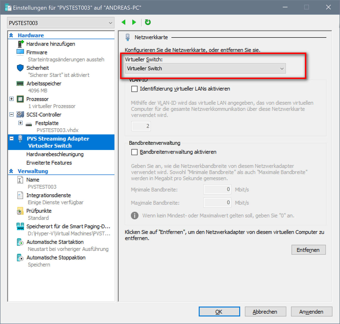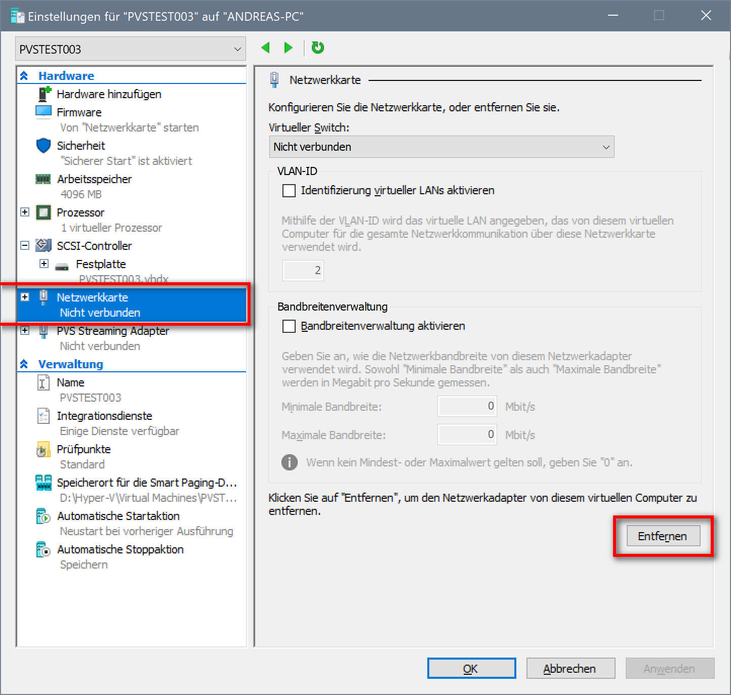 Nun wechselt man in die Hyper-V Verwaltungskonsole und die Einstellungen der VM zu bearbeiten. Die erste Netzwerkkarte mit dem Namen „Netzwerkkarte“ wird gelöscht, da nur die neue durch das Skript angelegte Netzwerkkarte mit dem Namen „PVS Streaming Adapter“ benötigt wird.