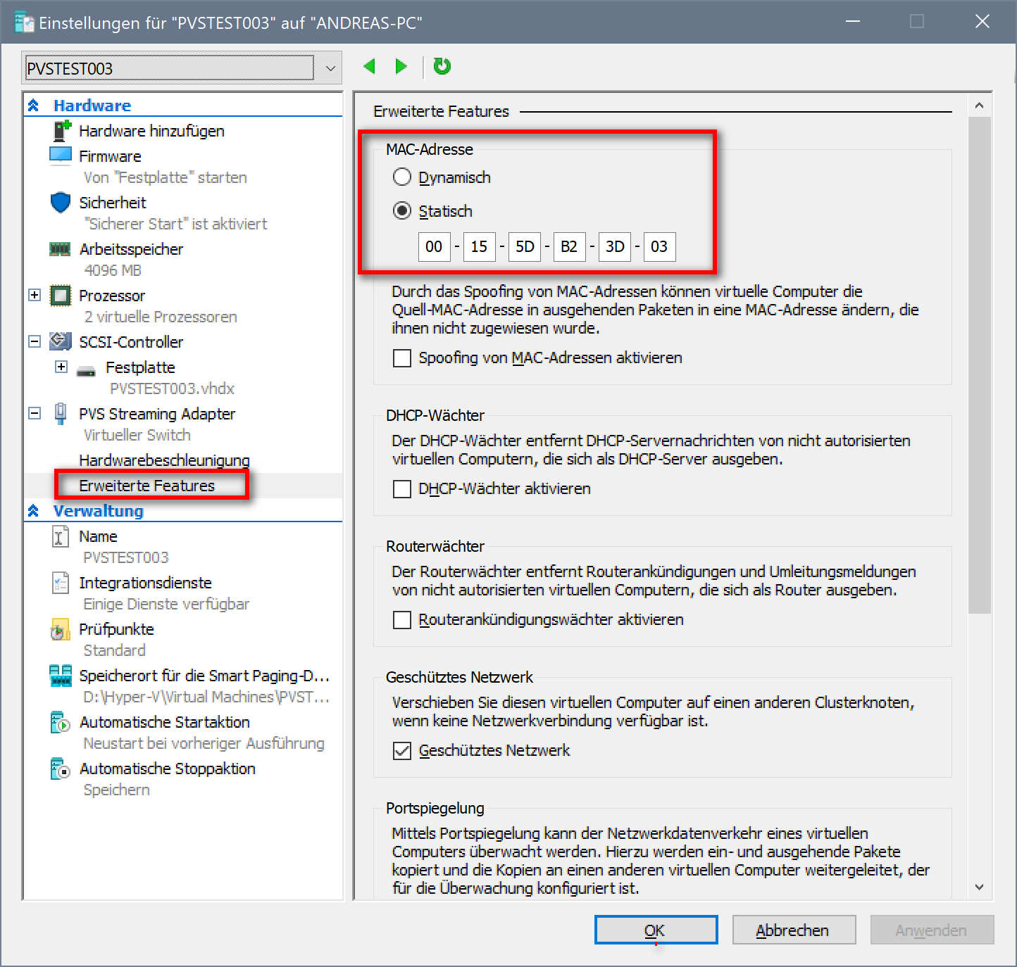 Nun konfiguriert man die „PVS Streaming Adapter“ Netzwerkkarte, man fügt ihr das geünschte Netzwerk mittels Virtuellen Switch hinzu, und optional empfehle ich auch die Vergabe einer statischen MAC Adresse statt der automatisch generierten.