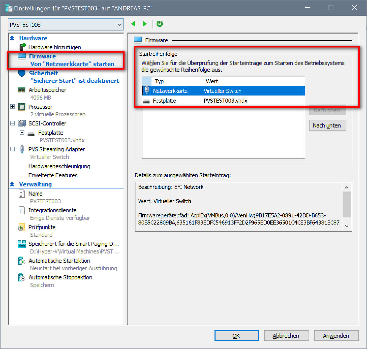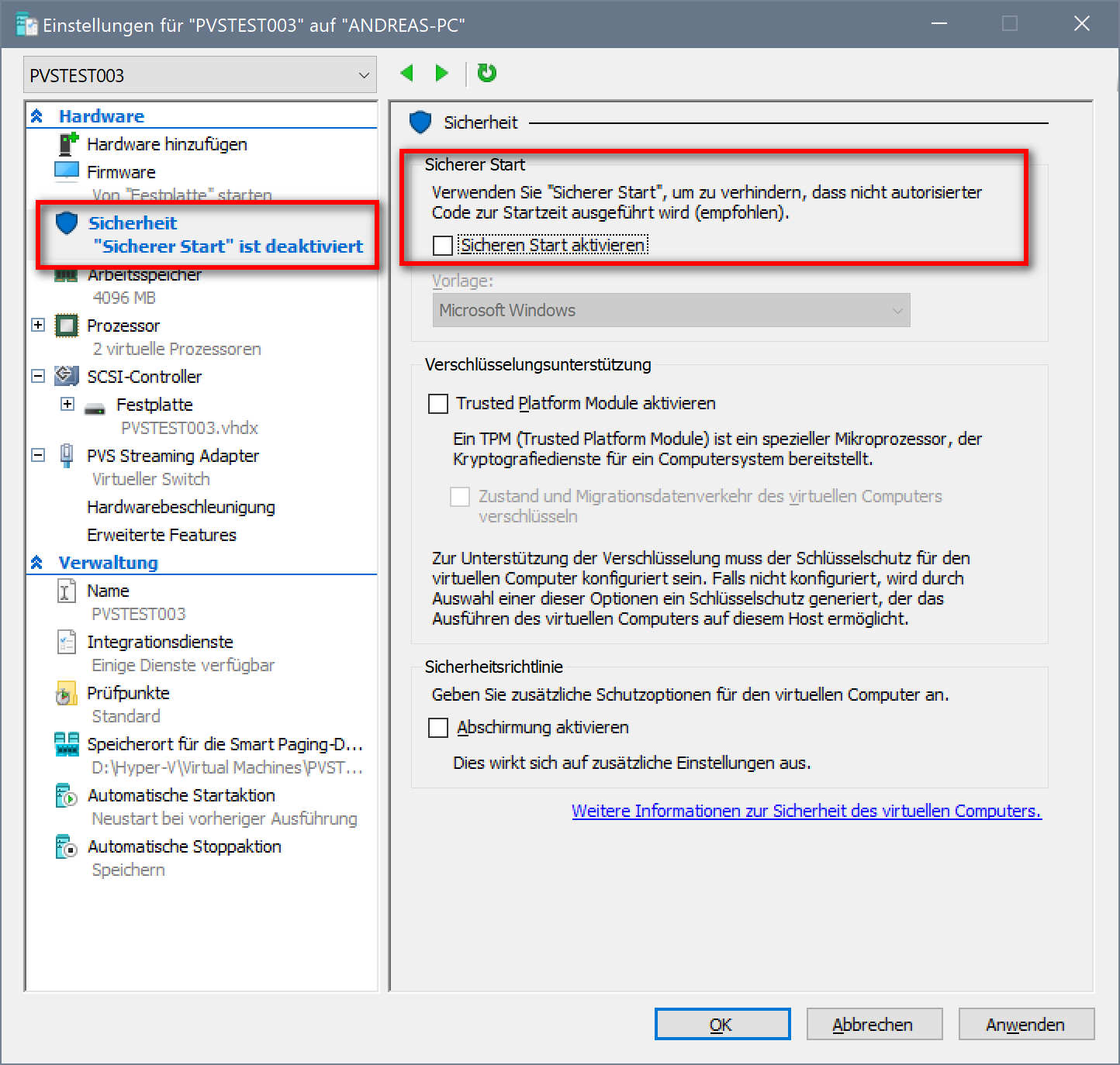 Da Hyper-V Gen 2 VMs per Default Secure Boot aktiv haben, dies von den Provisioning Services aber nicht unterstützt wird, ist dies zu deaktivieren.
