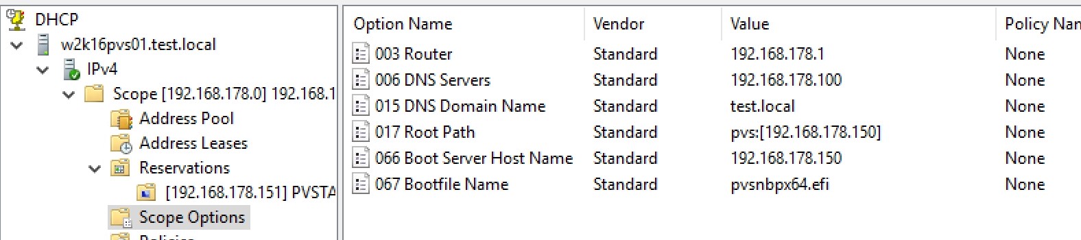 Da Hyper-V bei VMs vom Typ „Generation 2“ kein BIOS sondern UEFI verwenden sind am Provisioning Server dafür einige zusätzliche Konfigurationsschritte nötig. Es muss dafür gesorgt werden, dass in den DHCP Optionen zusätzlich die DHCP Option 11 RLP Server oder DHCP Option 17 Root Path gesetzt wird. Außerdem muss noch dafür gesorgt werden, dass als Bootfile nicht mehr ardbp32.bin sondern pvsnbpx32.efi bzw. pvsnbpx64.efi verwendet wird. Dies kann man entweder direkt über die DHCP Option 67 Bootfile Name machen, oder über das BOOTPTAB Hilfsprogramm auf dem Provisioning Server. Weiterführende Informationen hierzu findet man unter https://docs.citrix.com/en-us/provisioning/current-release/configure/configure-uefi
