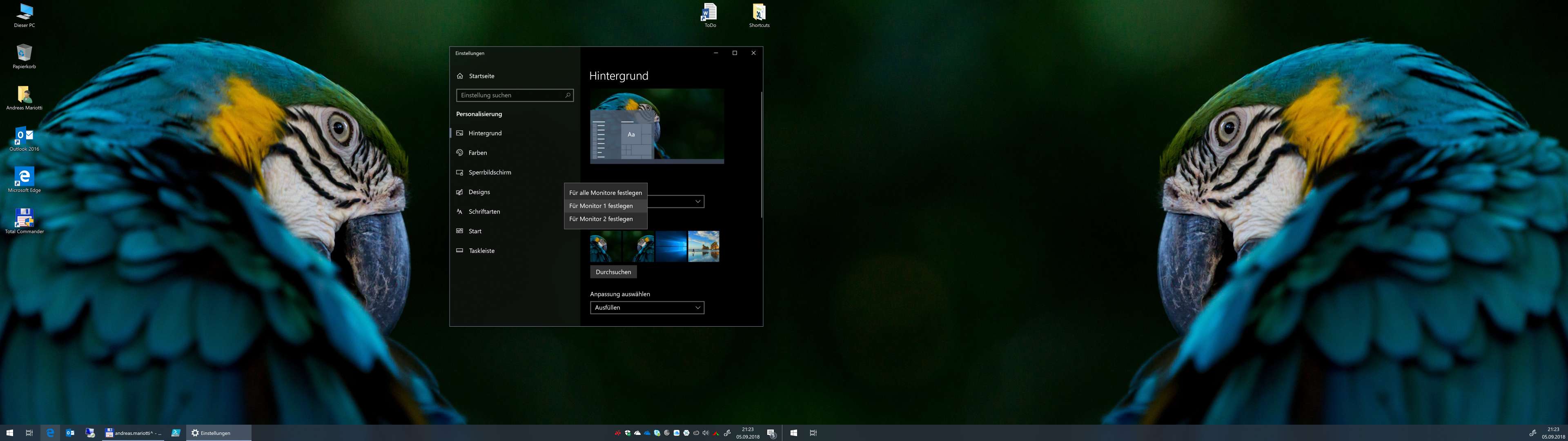In Windows 10 ist es möglich auf Systemen mit mehreren Monitoren für jeden Monitor ein unterschiedliches Hintergrundbilder zu definieren. Die Funktion hierzu ist etwas versteckt, deshalb möchte ich sie hier kurz zeigen.