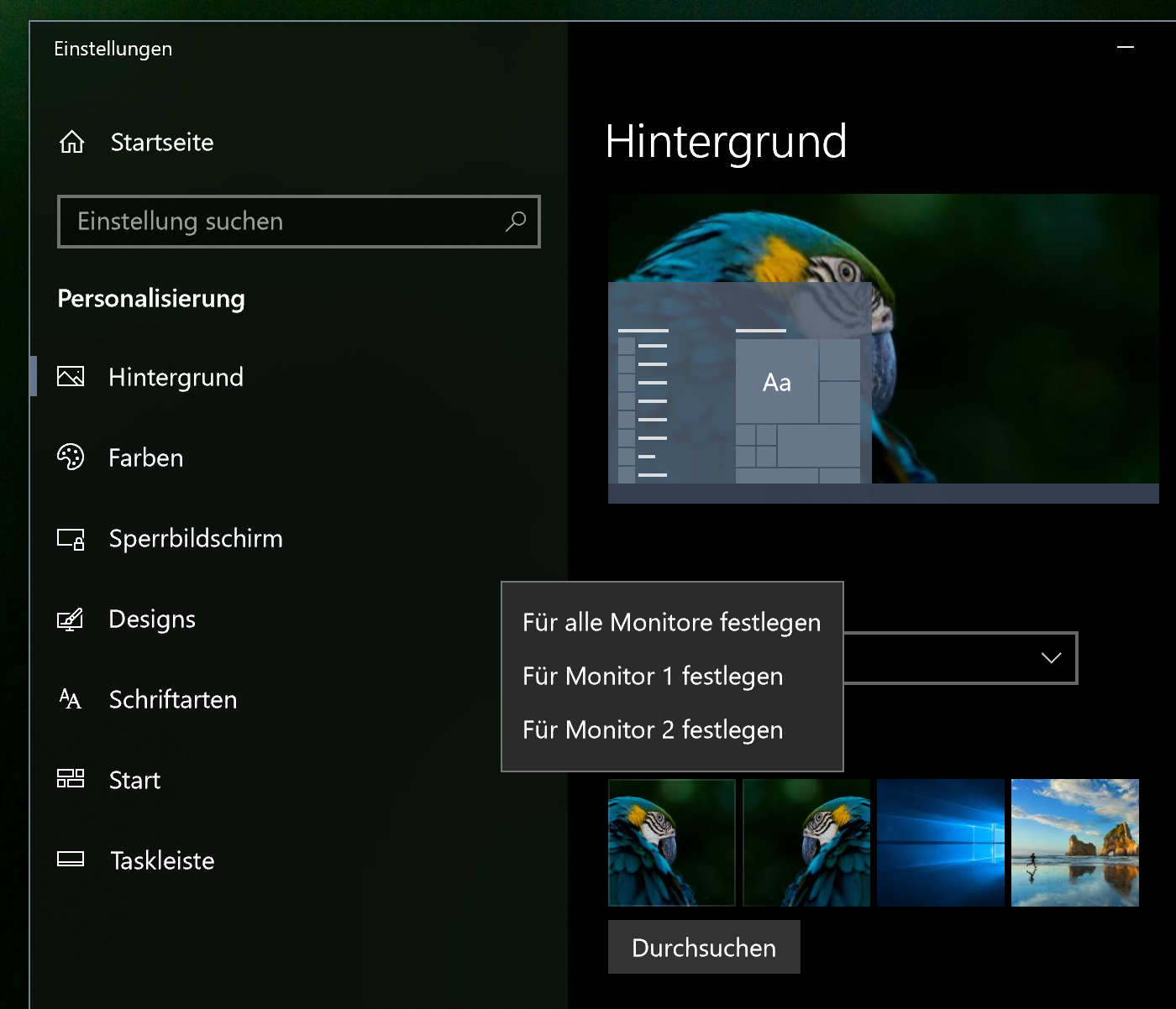 Man muss in Anzeigeneinstellungen in der Sektion „Hintergrund“ unterhalb von „Bild auswählen“ die Bilder die man verwenden will einmal mittels „Durchsuchen“ „importiert haben, und dann klickt man mit der rechten Maustaste auf das entsprechenden Bild und wählt dann „Für Monitor 1 festlegen“ bzw. „Für Monitor 2 festlegen“ und so weiter falls man noch weiter Monitor hat.