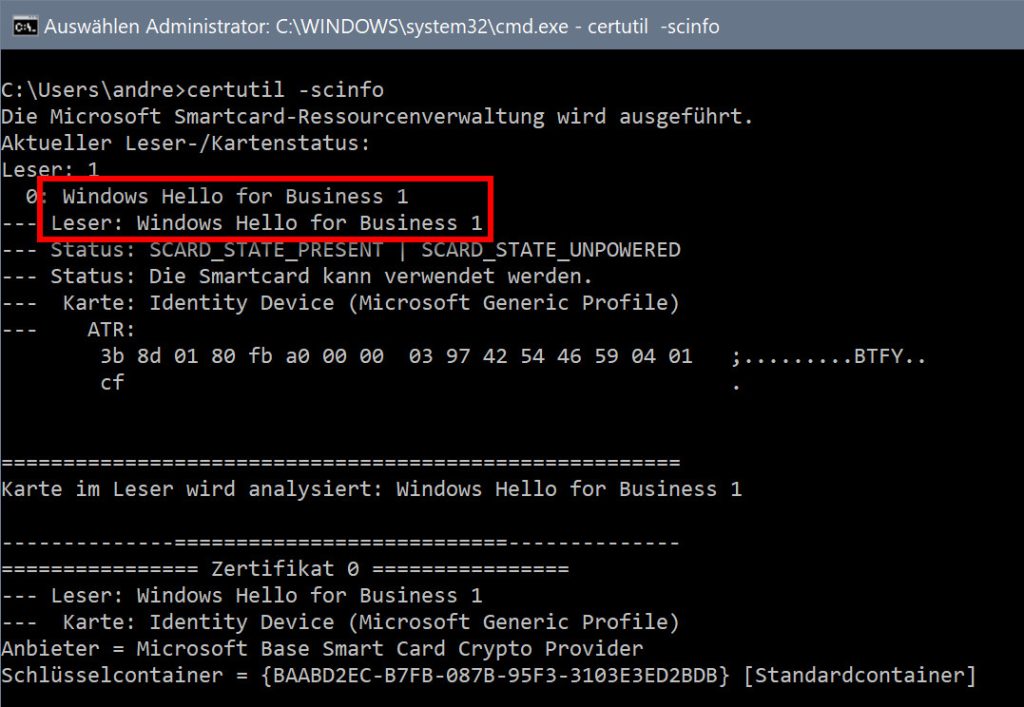 Diesen virtuellen Smartcard Leser incl. virtueller Smartcard sieht man wenn man in der Eingabeaufforderung „certuil.exe -scinfo“ aufruft als „Windows Hello for Business 1“, man sieht dies sowohl am lokalen Rechner, als auch innerhalb der Citrix Sitzung wenn die Smartcard Redirection aktiv ist, hier ein Beispiel: