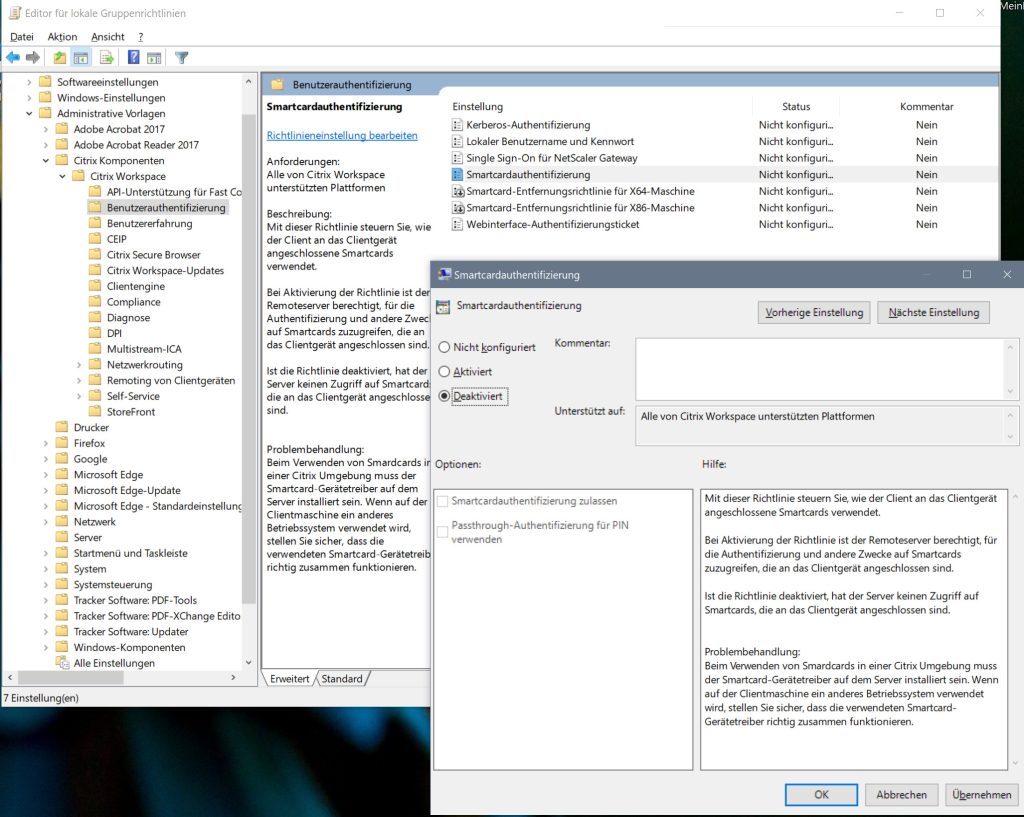 Mein aktueller Workaround besteht darin, dass ich mir die Citrix Workspace App mittels lokaler Gruppenrichtlinie und der receiver.admx Datei so konfiguriert habe, dass Smartcards nicht mehr von meinem Rechner aus in Citrix Sitzung durchverbunden werden. Dies hat das Problem für mich umgangen. Es ist aber natürlich nur ein Workaround, das Problem ist damit nur umgangen, aber nicht gelöst. Der Workaround funktioniert natürlich nur, wenn man nicht anderweitige Smartcards bewusst in die Citrix Sitzung verbinden will.